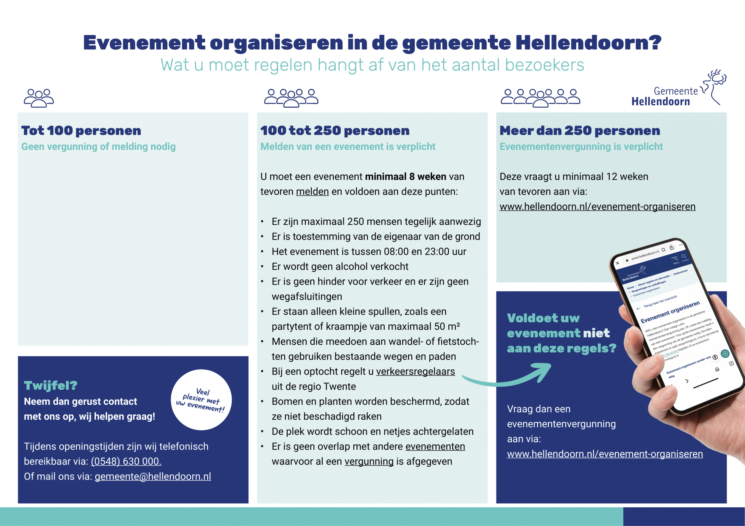 Wilt u in de gemeente Hellendoorn een evenement organiseren, zoals een braderie, optocht, straatfeest, sport- of muziekevenement, buurtfeest of herdenking? En is dit evenement openbaar toegankelijk? In sommige gevallen is een melding voldoende. In andere situaties heeft u een evenementenvergunning nodig. Kijk op onze Infographic en zie in één oogopslag waar je evenement onder valt: