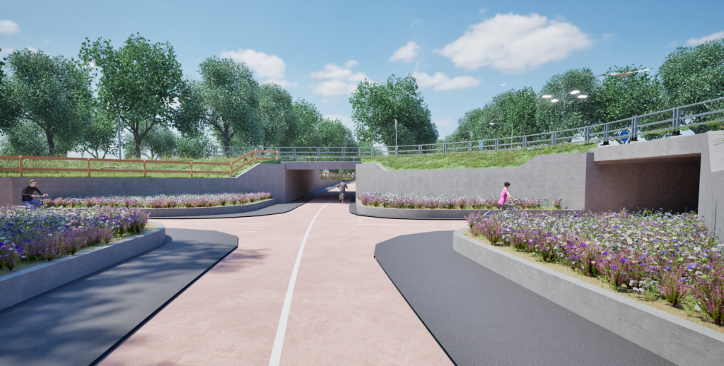 In de afbeeldingen hieronder ziet u een overzicht van de ligging van de rotonde, de fietspaden en de tunnels, met daarbij enkele impressies van de tunnels en de omgeving.